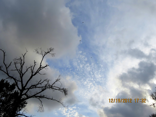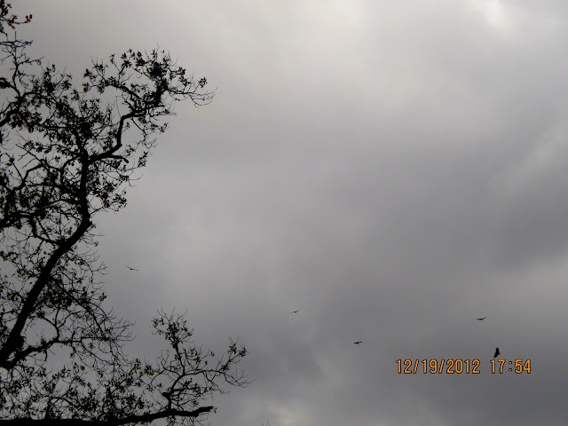 I had some extremely happy guests yesterday. The buzzards were having so much fun flying in the high winds that they did not land in the sun tree! So I stood out in the road and photographed the buzzards flying in and the clouds growing out of white chemical dots into big, bad Leroy Browns! My clear blue morning skies clouded up and were sailing North at a high rate of speed!
