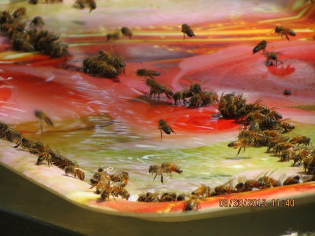 Of course I brought You a million bees to bring in September! I hope You enjoy the big Buzz! Tonight your photostudy is a bee update on my visiting swarm. This morning they swarmed a feeder on the courtyard porch. As I walked out the door, I could hear all the buzzing and see hundreds or so flying around my head at warp speed. I actually became part of the swarm for a few moments until I walked out of it. It was really cool. I am not frightened as they do not sting when they are in swarm mode (unless they get trapped somewhere). However, as I backed off, I remember why my kids will not bring the grandkids here when the bees are here. Bees just seem to frighten everybody without knowing they do so. Maybe when can change that. They are really cute.