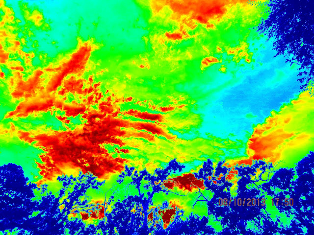Welcome to my world where the trees are blue and the sky is green and red!!!! This is called Heat Map Effect in the Picasa Editing Program. One finger to click on one button is all it takes to change your photos also. (Check it out in the Google Index). I make these images into colorful cards for the Bird Sanctuary. The real photoshoot is after the Heat Maps. It is the raincloud that did not rain on Rainbow Creek. Enjoy!